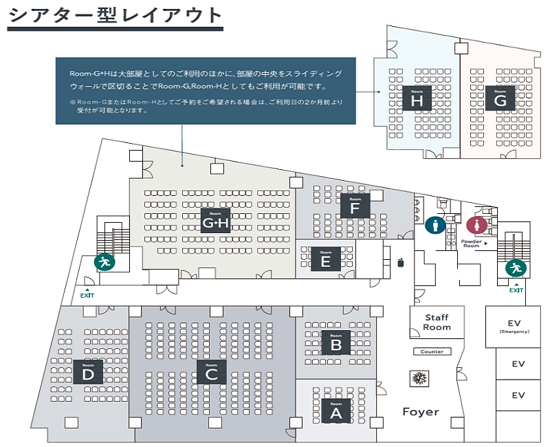 120名収容のRoom-Cと併せてご利用いただくことで、同時進行で大人数の催しが可能です。