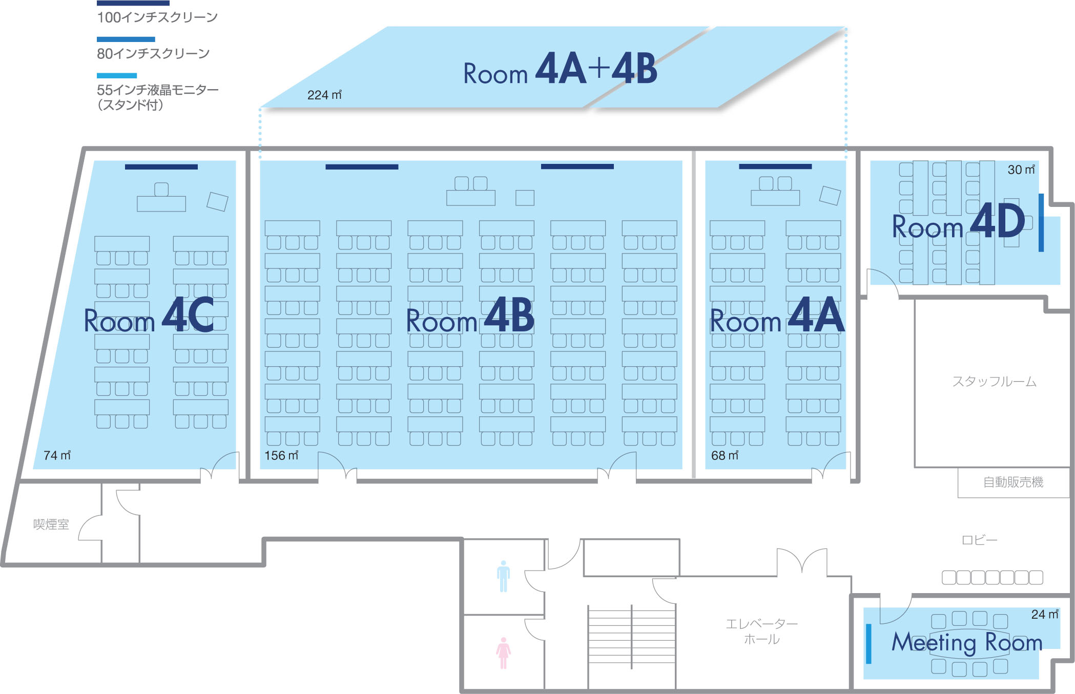 | 会場名 | 面積 | レイアウト別収容人数 | 目安価格 (1時間) |